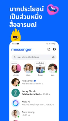 เพิ่มมิติใหม่ให้กับการสนทนาและชีวิตประจำวันของคุณด้วย Meta AI ผู้ช่วยอัจฉริยะที่พร้อมตอบทุกคำถาม ให้คำแนะนำที่เป็นประโยชน์ หรือแม้แต่ช่วยทำการบ้านได้อย่างรวดเร็วทันใจ ปลดล็อกจินตนาการของคุณด้วย Meta AI ที่เป็นเสมือนคู่หูด้านการสร้างสรรค์ ช่วยให้คุณสร้างสรรค์ แก้ไข หรือแม้กระทั่งทำให้รูปภาพของคุณมีชีวิตชีวาได้อย่างง่ายดาย สร้างประสบการณ์ที่ไม่เหมือนใครผ่านการโต้ตอบกับ AI (หมายเหตุ: Meta AI ให้บริการในบางภาษาและบางประเทศ)
