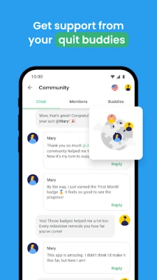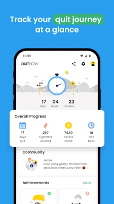 QuitNow PRO นำเสนอหน้าจอหลักที่ออกแบบมาเพื่อสะท้อนความสำเร็จของคุณอย่างชัดเจน คุณจะเห็นเวลาที่ผ่านไปนับตั้งแต่การสูบครั้งสุดท้าย จำนวนมวนบุหรี่ที่คุณไม่ได้แตะต้อง เงินที่คุณประหยัดได้ และเวลาชีวิตอันมีค่าที่คุณได้กลับคืนมาอย่างละเอียด นอกจากนี้ เราเข้าใจดีว่าการสนับสนุนจากเพื่อนร่วมทางเป็นสิ่งสำคัญยิ่ง ชุมชนแชทของเราจึงเต็มไปด้วยอดีตผู้สูบบุหรี่ที่พร้อมแบ่งปันประสบการณ์และให้กำลังใจกันและกัน สร้างสภาพแวดล้อมที่ปลอดบุหรี่และเต็มไปด้วยความเข้าใจ ซึ่งช่วยให้การเดินทางของคุณง่ายขึ้นอย่างไม่น่าเชื่อ ไม่เพียงเท่านั้น QuitNow PRO ยังจัดเซสชันถ่ายทอดสดกับนักจิตวิทยาผู้เชี่ยวชาญเป็นประจำทุกเดือน เพื่อให้คำแนะนำเฉพาะบุคคลและตอบคำถามแบบเรียลไทม์